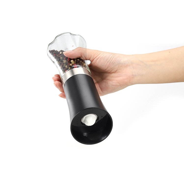 This salt and pepper mill set includes a battery-powered pepper mill and two matching spice jars, combining grinding and storage functions in one.