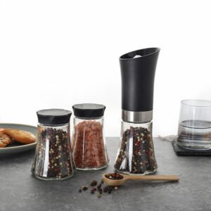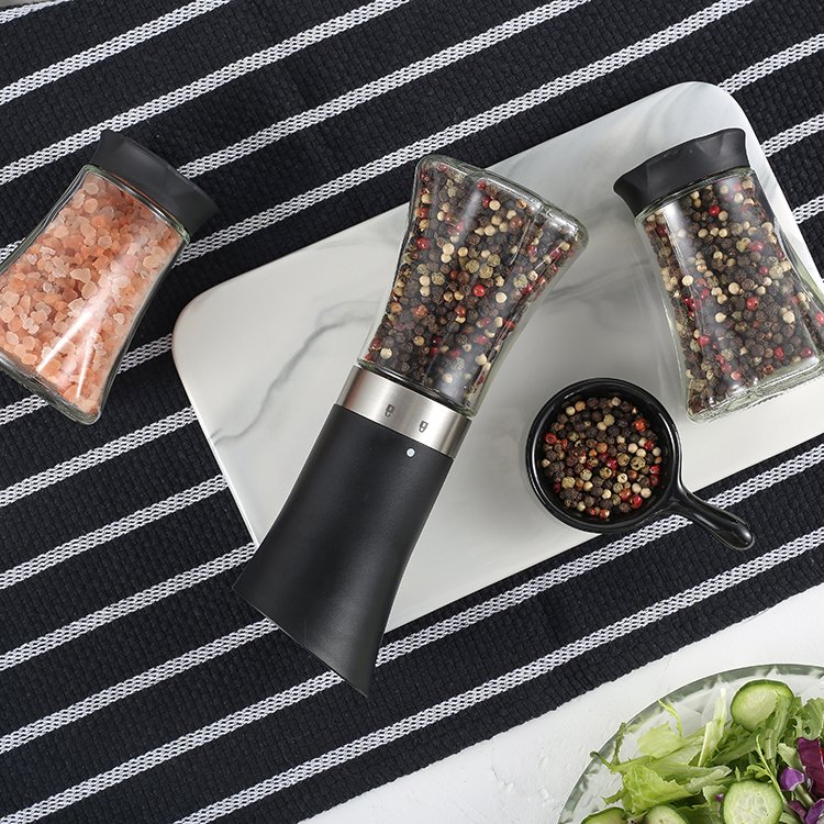 This salt and pepper mill set includes a battery-powered pepper mill and two matching spice jars, combining grinding and storage functions in one.