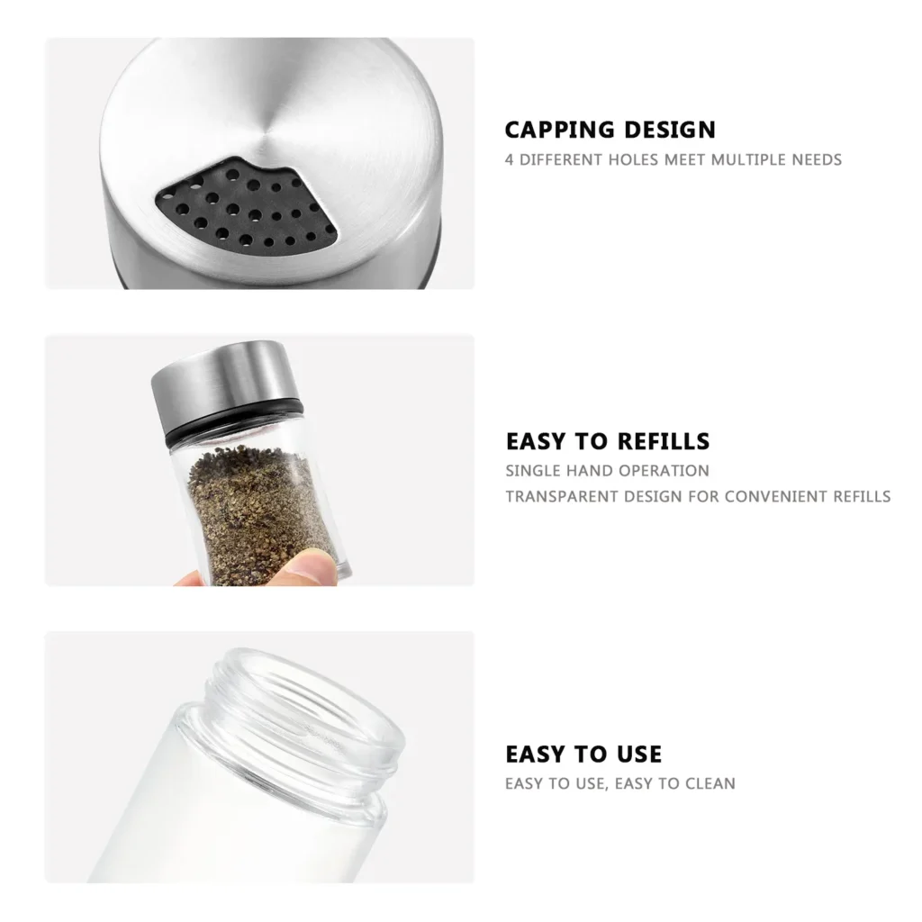 Each salt and pepper shaker is fitted with a twist-top lid that allows for easy switching between different dispensing modes. Whether it’s fine powders or coarse herbs, the lid ensures smooth and controlled dispensing, making it suitable for all types of seasonings.