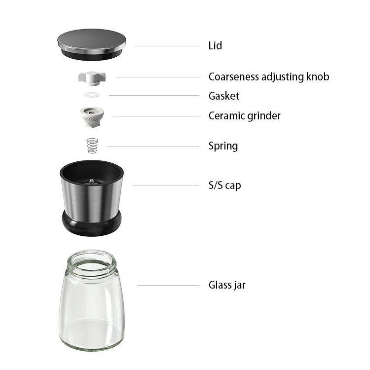 18/8 S/S, Ceramic Burr, Glass Bottle, Plastic